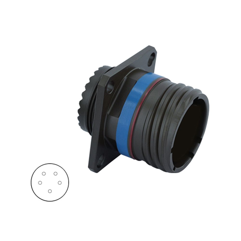 8D011Z05AA, Square Flange Receptacle, Shell Size 11 with Black Zinc Nickel (Z) Plating, 5#20 Less Pin Contacts, A Orientation.