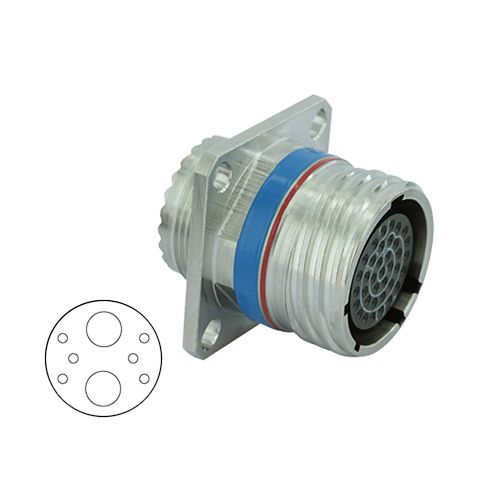 8D021S72SE, Square Flange Receptacle, Shell Size 21 with Stainless Steel Nickel (S) Plating, 6#16, 2#4 Power Socket Contacts, E Orientation.