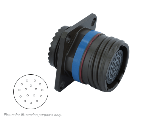 8D021Z16BD, Square Flange Receptacle, Shell Size 21 with Black Zinc Nickel (Z) Plating, 16#16 Less Socket Contacts, D Orientation.