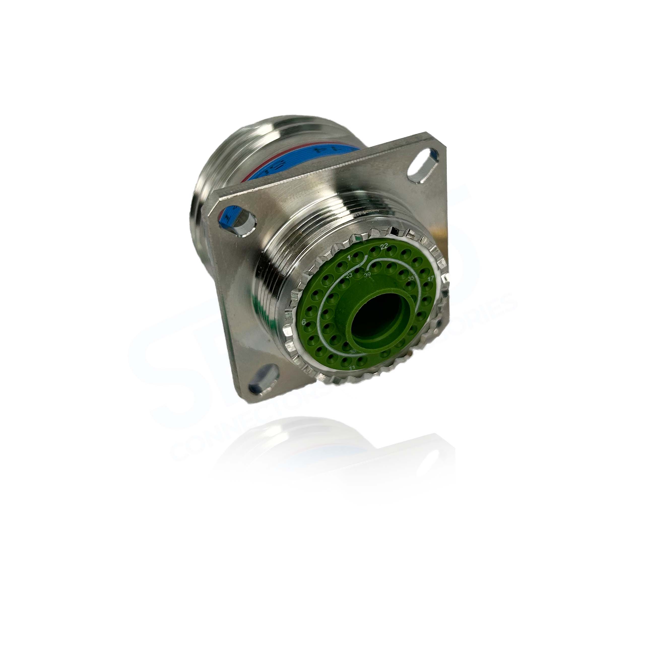 D38999/20KE2SA / 8D017K02SA, Square Flange Receptacle, Shell Size 17 with Passivated Stainless Steel Plating, 38#22D, 1#8 Triax Socket Contacts, A Orientation.